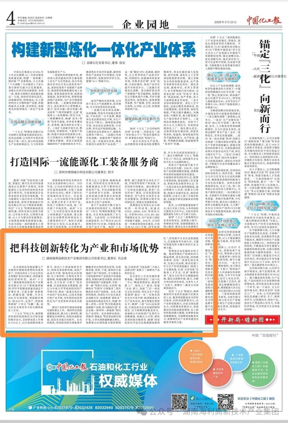 3月23日,《中国化工报》刊发湖南海利高新技术产业集团有限公司党委书记、董事长肖志勇同志署名文章《把科技创新转化为产业和市场优势》,有力展示了海利集团高质量发展的新担当新作为新成效,是集团党委深入学习贯彻党的创新理论的又一重要成果。